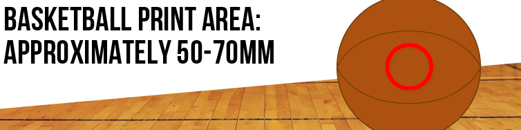 Print size for printed basketballs: The print area is approximately 50-70mm, depending on the print process and the layout of your design. The printing is semi-permanent and will wear during play, depending on the playing surface and conditions. The printed designs are UV cured to ensure that they are durable for play or promotional purposes. The dimpling on the ball itself does wear away which will also remove any print. If the ball is scuffed the printing will start to wear off from the outer surface of the ball.